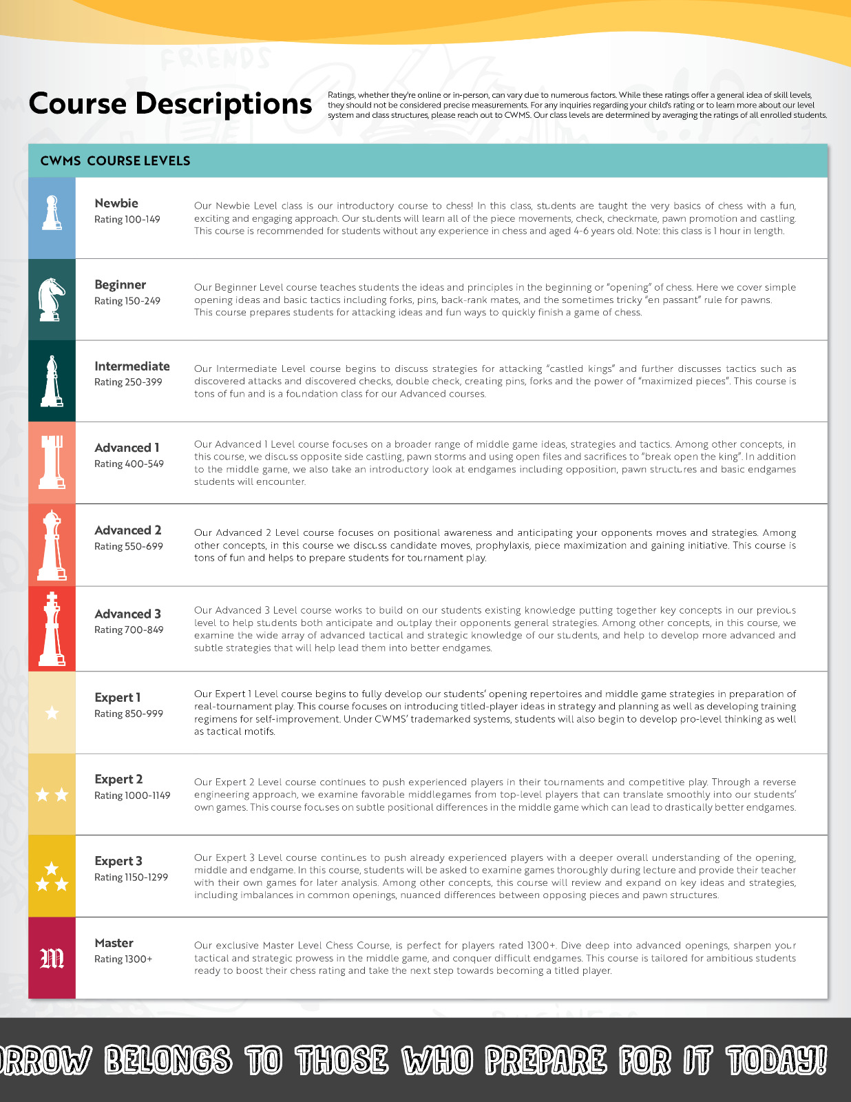 From absolute beginners to expert-level players, our structured curriculum is designed to grow with your child's skill and confidence. Each course is tailored to specific rating bands, with age-appropriate lessons, strategic goals, and tournament prep.